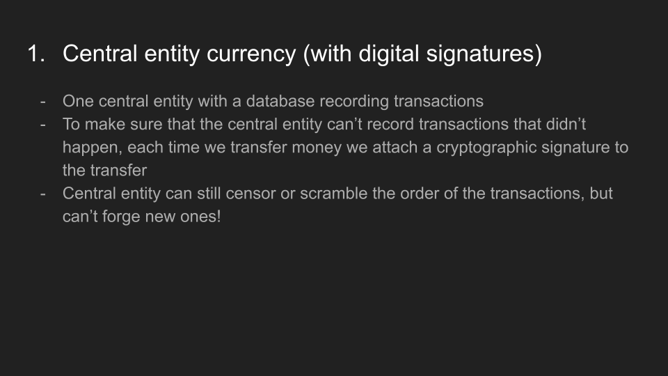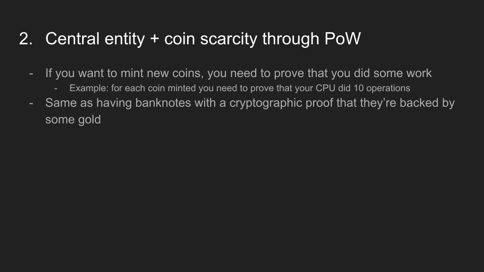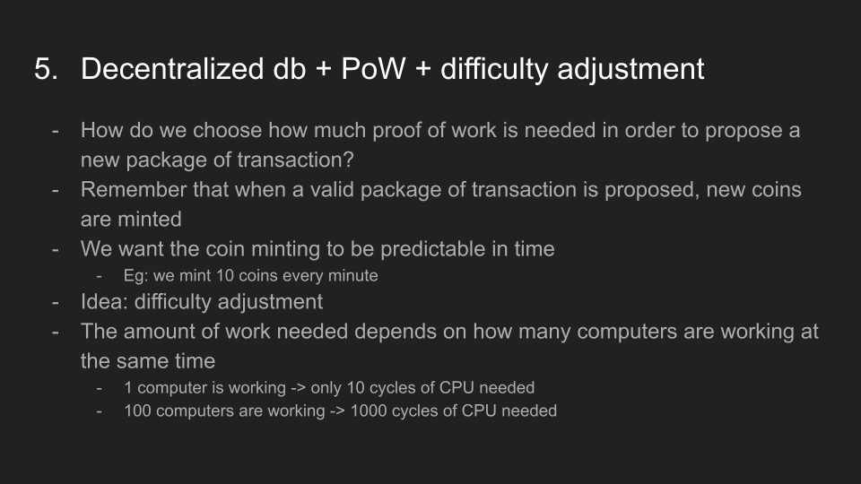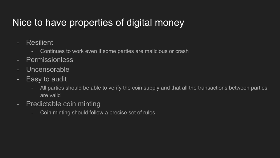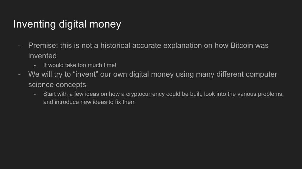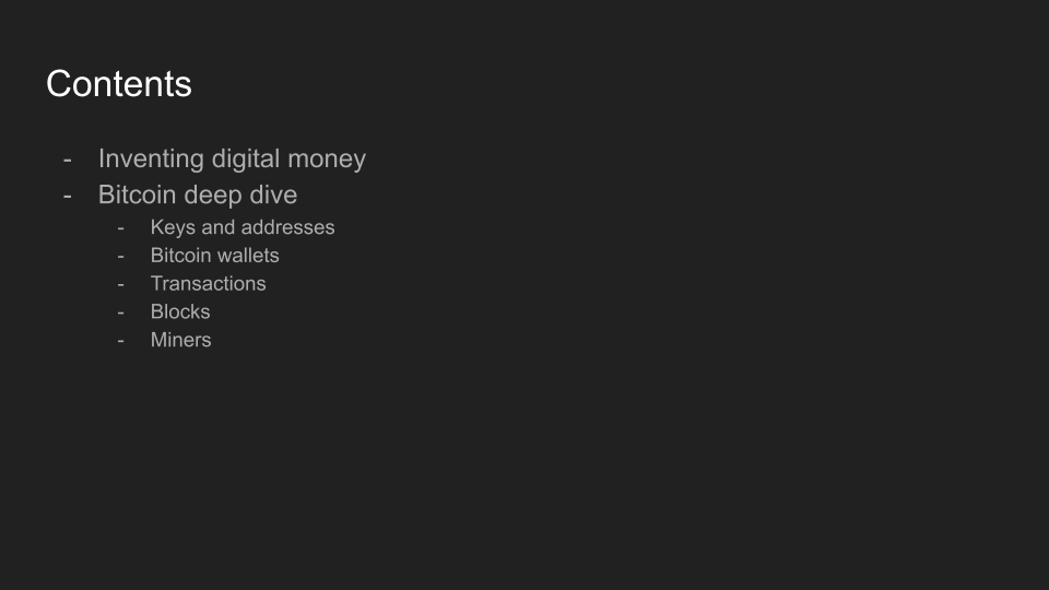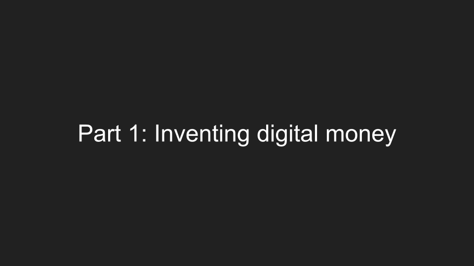 Part 1 is focused on trying to invent digital money: we start from a quite broken idea, creating a central entity currency, and try to improve it. This part introduces the fundamental concepts behind Bitcoin: public keys, PoW, difficulty adjustments.