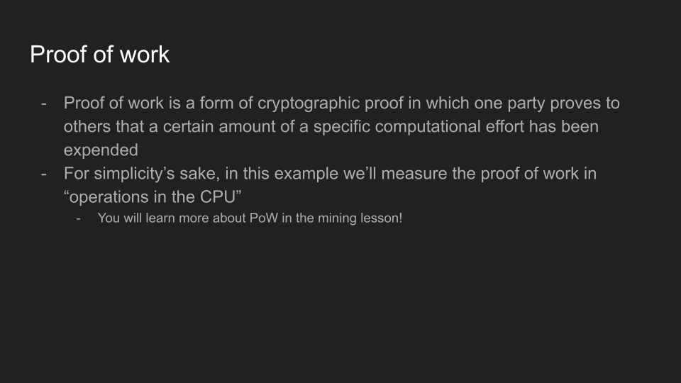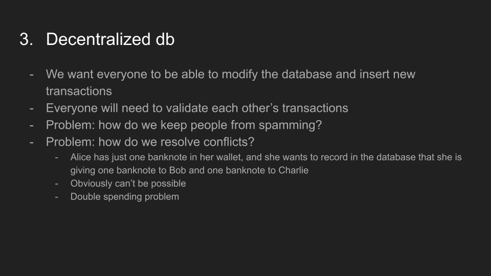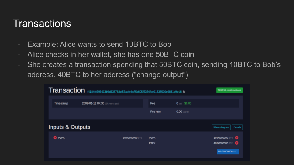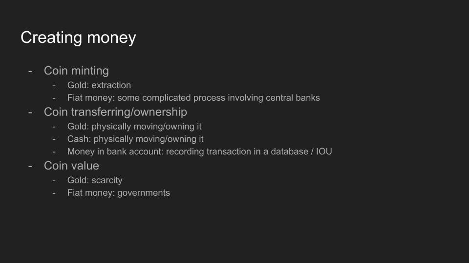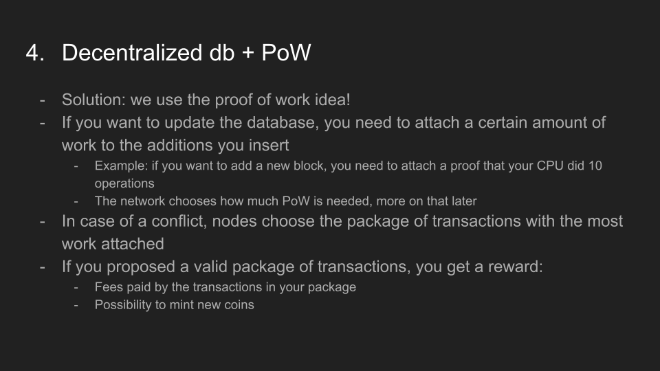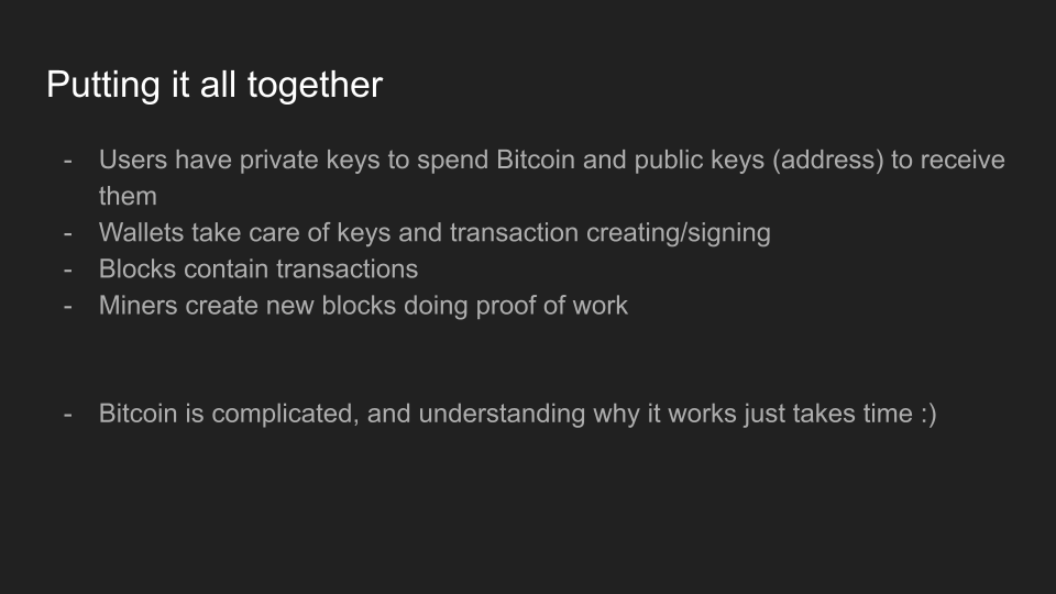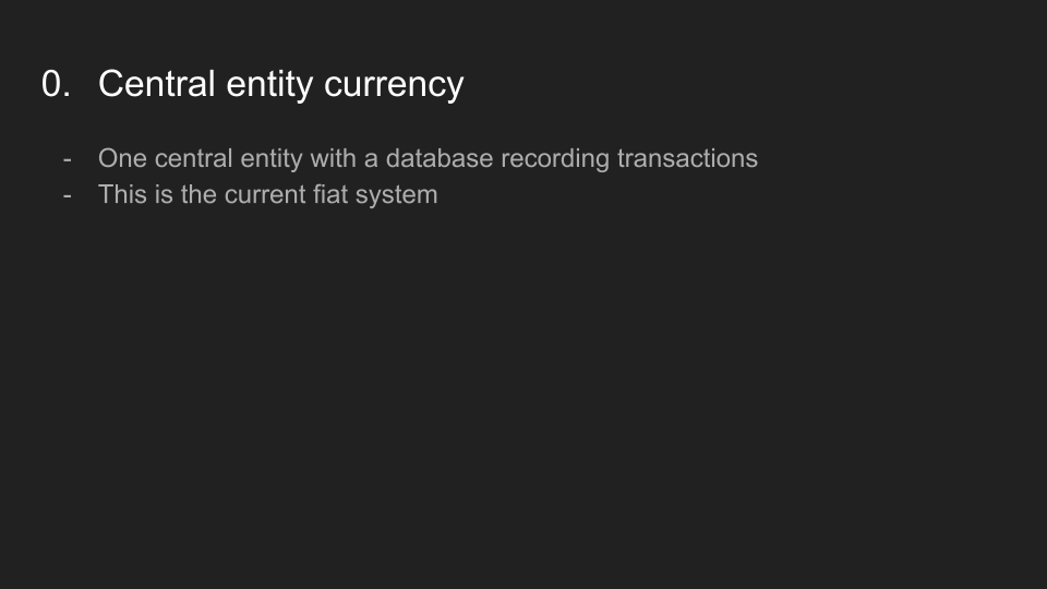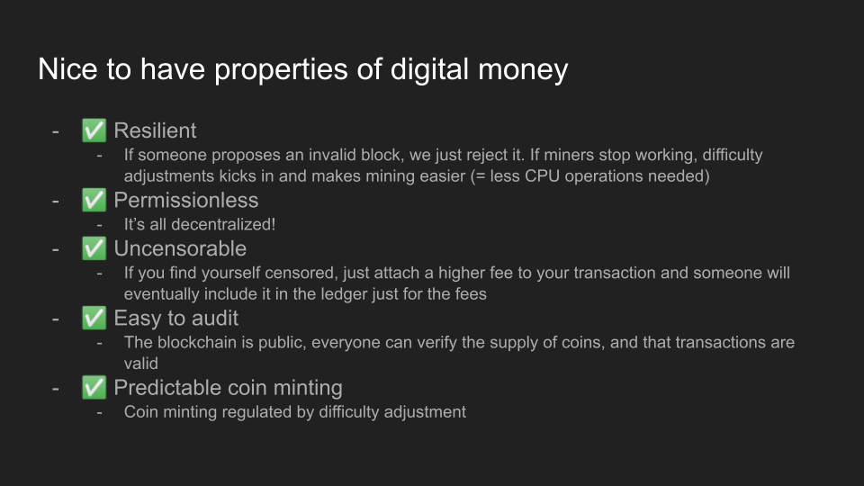 Part 1 is focused on trying to invent digital money: we start from a quite broken idea, creating a central entity currency, and try to improve it. This part introduces the fundamental concepts behind Bitcoin: public keys, PoW, difficulty adjustments.