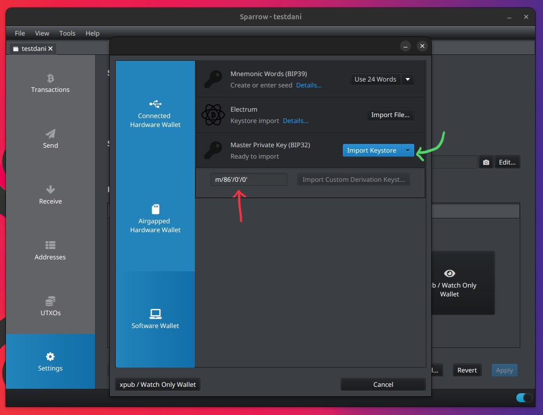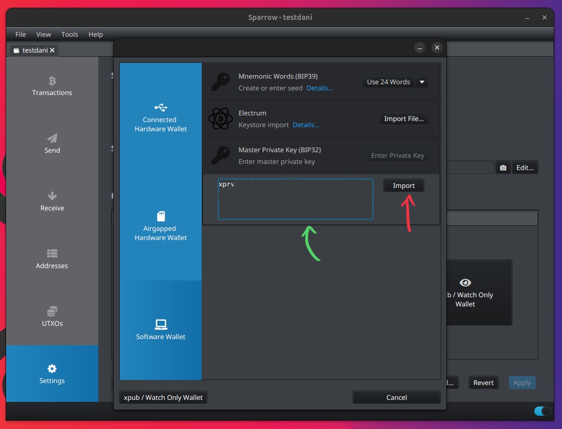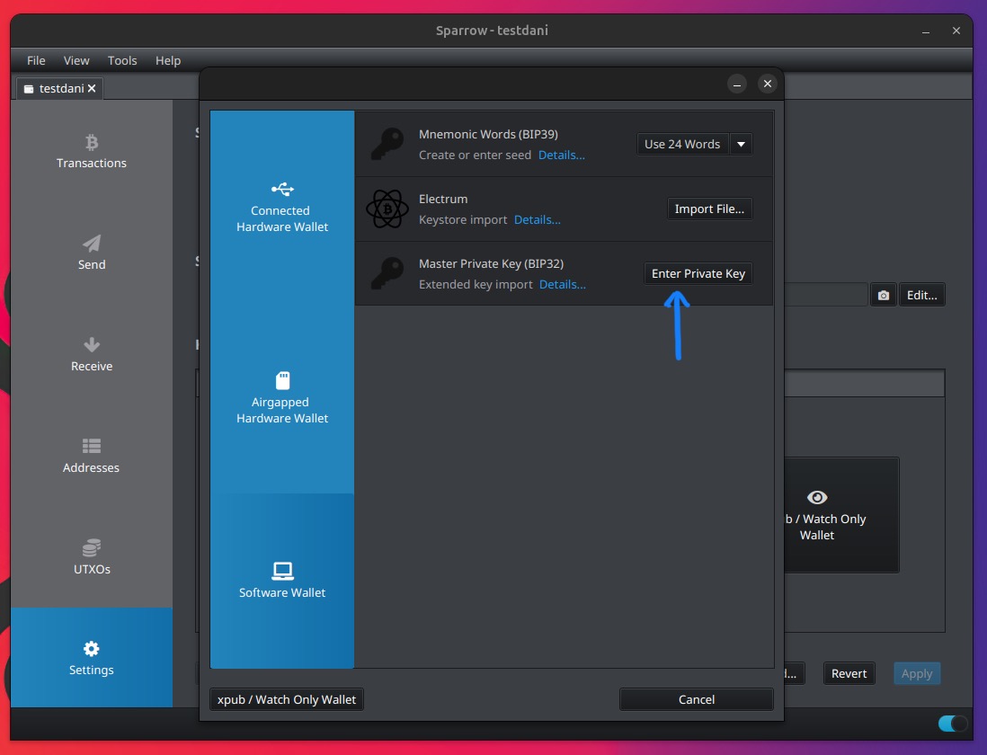 Select “Master Private Key (BIP32)” and import the key you got in Step 2.