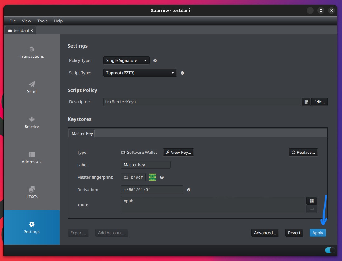Check that the first address shown by Sparrow is the same as the one we got in step 0 - if that’s the case, congrats! 🎉